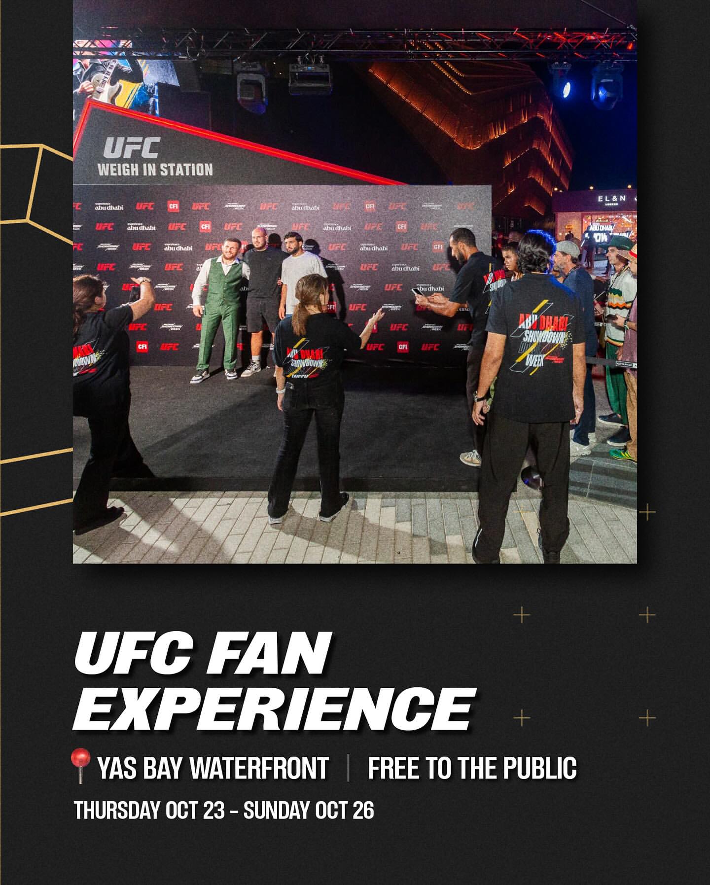 Yas Bay (Oct 22–26): The excitement continues by the waterfront — fans can try the UFC Hand Wrapping Workshop, snap a Weigh-in Photo, and participate in fun UFC-themed challenges and games all week long.